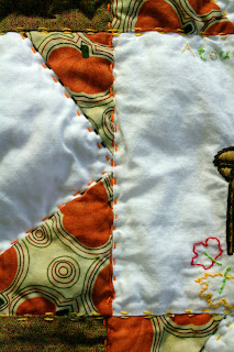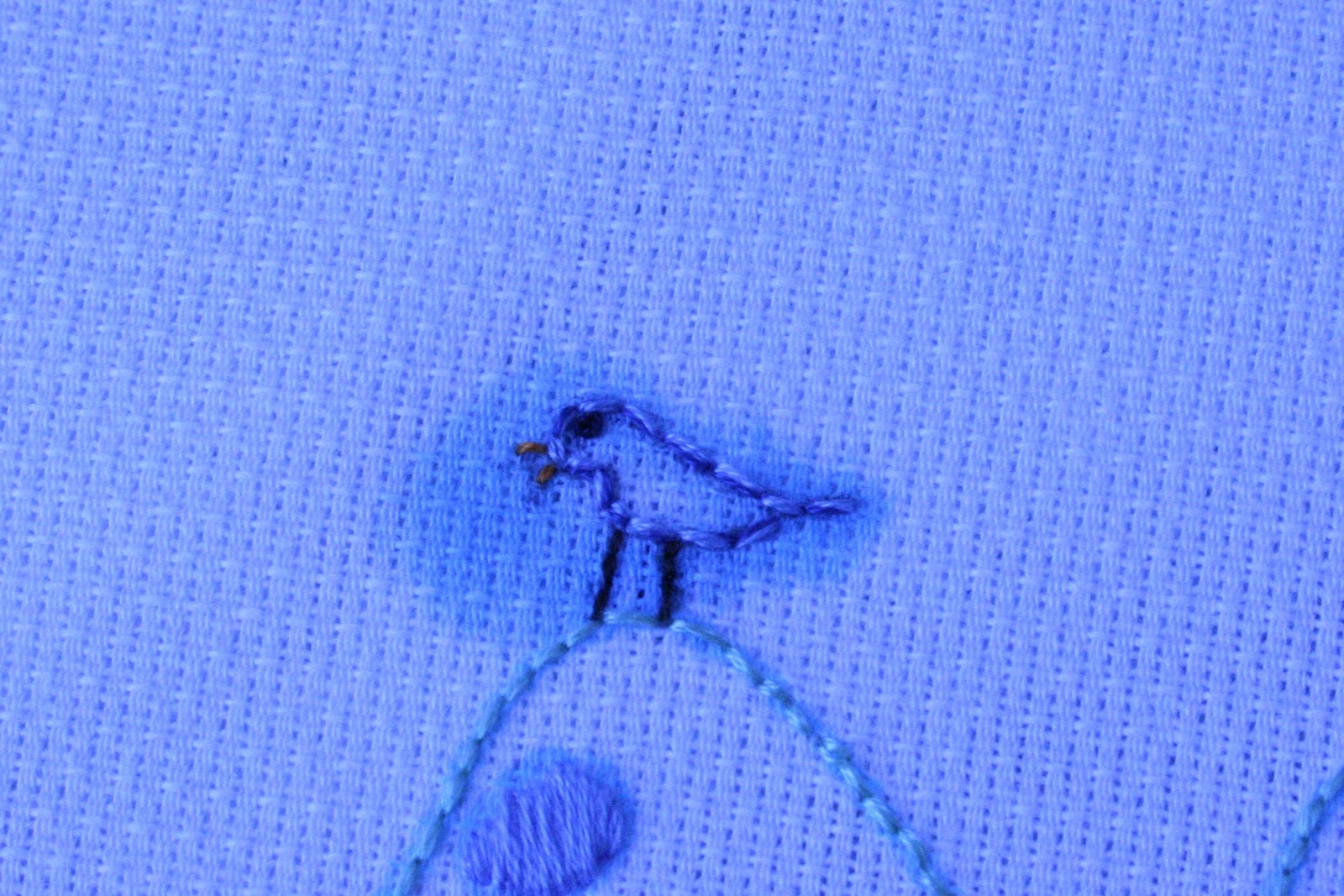 With all the blue MarkbGone pen it is hard too see my stitching on some areas, but you can get an idea of what I am working on now. I also had to redo the birdie, it was looking a bit rough around the edges;) I really like how the two toned thread came out on him though and his little beak is pretty cute!