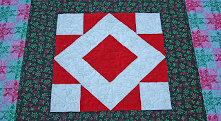 There were some red and cream blocks that I had used in a baseball quilt for my brother last year that I had leftover with no home. This worked out lovely for the theme---love it when that happens! There is also a collaborated bible verse that I sewed on the back in the middle of that diamond: Luke 2:10 & 19.